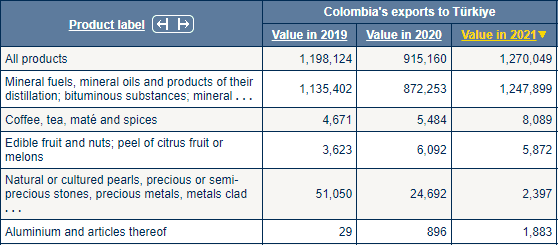 Kolombiya'da ithal edilen ilk beş sıraya baktığımızda; (1)Mineral yakıtlar, mineral yağlar ve bunların damıtılmasından elde edilen ürünler; bitümlü maddeler; mineral, (2)Kahve, çay, maté ve baharatlar, (3)Yenilebilir meyve ve kuruyemişler; narenciye veya kavun kabuğu, (4)Tabii veya kültür incileri, değerli veya yarı kıymetli taşlar, değerli metaller, kaplama metaller, (5)Alüminyum ve bunlardan mamul eşyaları görüyoruz.