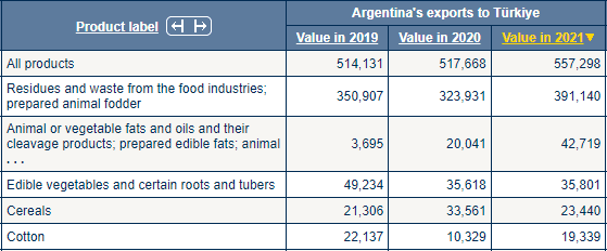 Arjantina'da ithal edilen ilk beş sıraya baktığımızda; (1)Gıda endüstrisinden kaynaklanan kalıntılar ve atıklar; hazır hayvan yemi, (2)Hayvansal veya bitkisel katı ve sıvı yağlar ve bunların parçalanma ürünleri; hazır yemeklik yağlar; hayvan, (3)Yenilebilir sebzeler ve bazı kökler ve yumrular, (4)Hububat, (5)Pamuk görüyoruz.