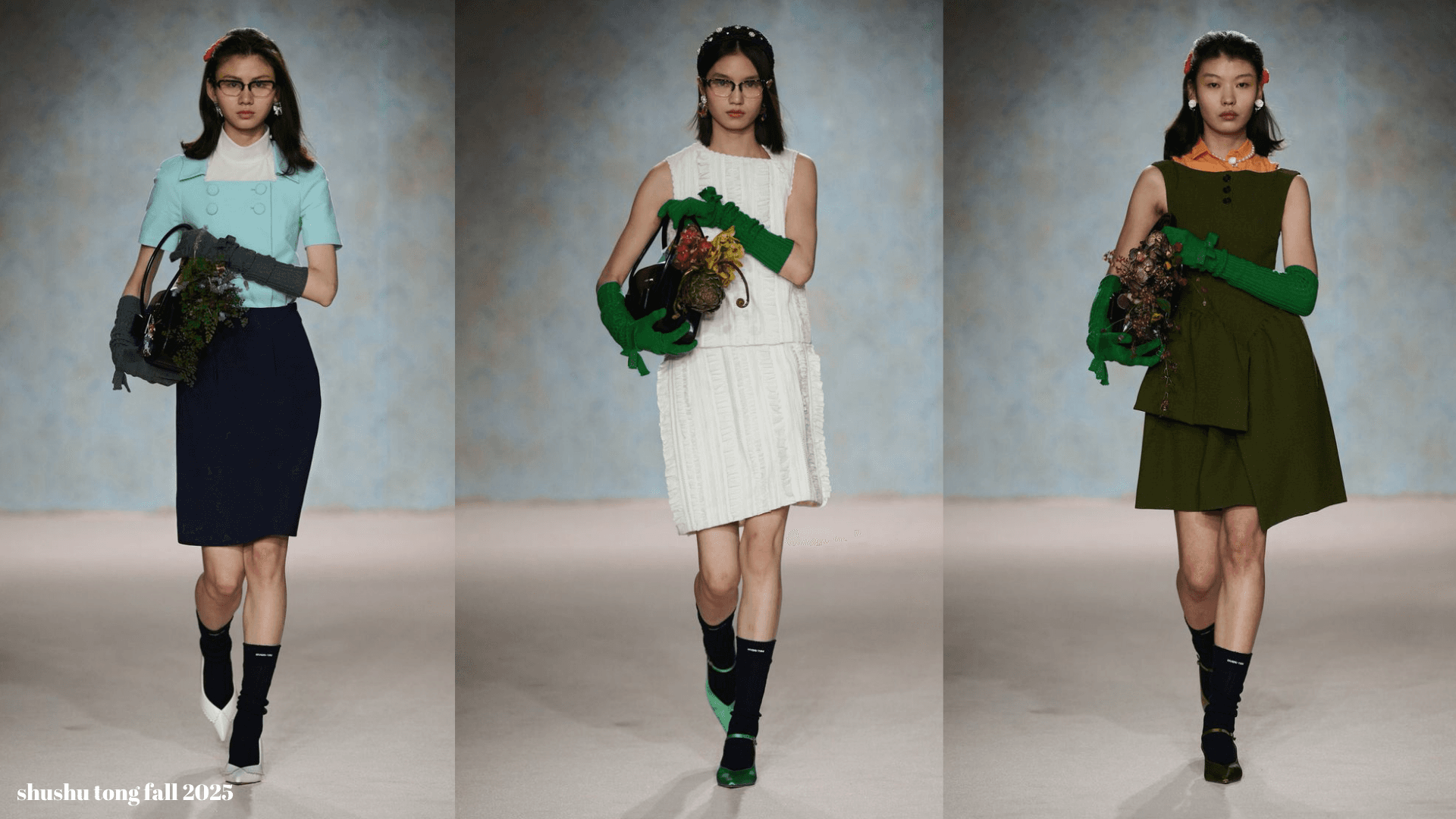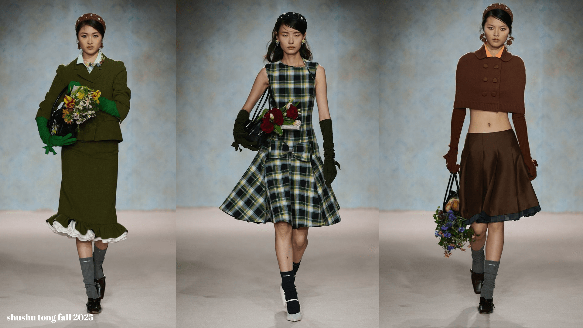 Aslında bu koleksiyon bana, sadece ikiz görünümünden değil, iki farklı karakterden ve iç içe geçmiş çift anlamlardan ilham alınmış gibi hissettirdi. Yani evet, dışarıdan bakınca masum, evcimen ve hafif muhafazakâr bir “Tofaş Annesi” var ama detaylara dikkat ettiğinde fark ediyorsun ki, o gençliğinde mahalledeki karizmatik solcu erkekleri kendine aşık etmiş, saçlarını gizlice boyamış, geceleri rüyasında dünyanın üzerinde oturan asi kız hâlâ orada. Bastırılmamış, sadece dantel yaka altına saklanmış. Renk paletine baktığımızda da zaten hemen bu hissi veriyor: Nostaljik evlerin içinden gelme o toprak tonları, derin yeşiller, açık griler... Sanki salonun perdesiyle koltuk takımını uydurmuşlar. Ya da çeyiz sandığındaki mavi ipek bluzla mutfak dolabının rengi aynı. Ama işte SHUSHU TONG bunu alıp, öyle zekice bir şekilde yorumluyor ki podyumda bu “ev havası” bambaşka bir şeye dönüşüyor. Ayrıca koleksiyonda -ki asla dikkatimden kaçmaz- bir miu miu enerjisi de gördüm. Biliyorum her ''katmanlı giysi'' olayı miu miu'ya özgü değil belki ama...benim aklıma ilk o geliyor. Ki bu detaya da bayıldım. Kalın örme trikolar, düz polo yakalar, uzun etekler....tofaş annelerinin sert bakışları ve çantalarında taşıdıkları çiçekler. Zıt ama birbirini tamamlayan detaylar. Bu lookları aslında istersek biz de yapabiliriz bence. Annelerimizin dolaplarında biraz gezinsek aslında eski bir trikoyu uzun bir etekle matchleştirip giyebiliriz. Tabii bizde de o modellerdeki gibi durur mu bilmiyorum...burada da araya aksesuarlar girer bence. Saç, makyaj ve yeteri kadar takıyla her şeyi başarabiliriz kızlar. İstersek hem bir Shushu Tong kızı hem de bir Tofaş Annesi olabiliriz...