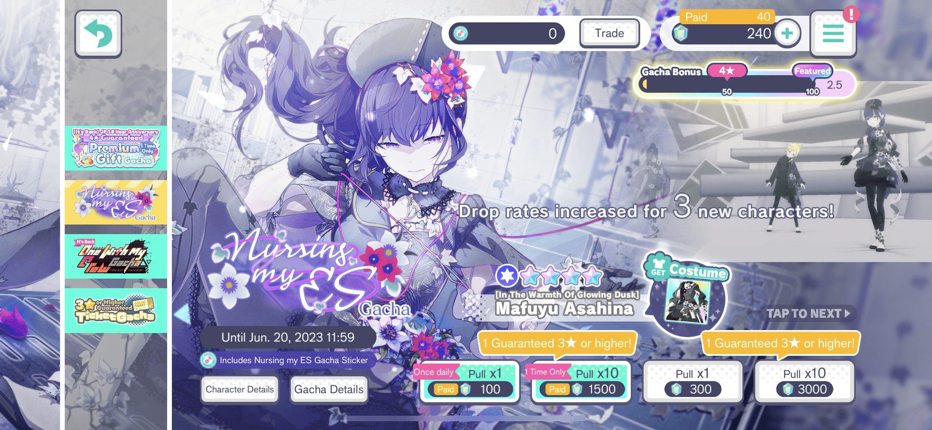 The game has a gacha system. With every event, there is a new gacha. People can pull the cards of their favorite characters with crystals. Some people hate it and some people love it. For me, I am one of those who have terrible luck. There are 1*,2*,3* and 4* cards of every character. They all have different effects and artwork. Most people pull them because of the artwork. They also unlock some stories and enhance the gameplay.