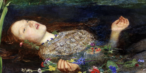 Waterhouse also depicts the women characters from William Shakespeare's plays, mainly the tragic beauty of Ophelia. Ophelia is a tragic female character in William Shakespeare's drama Hamlet. Waterhouse has more than one painting depicting Ophelia and his portrayal of Ophelia varies in each of these paintings. Waterhouse portrays Ophelia in a total of four stages, three of them before her death, and the final painting depicts her death. In each of the three and the final paintings, Ophelia is always depicted with an abundance of flowers and is always one with nature.