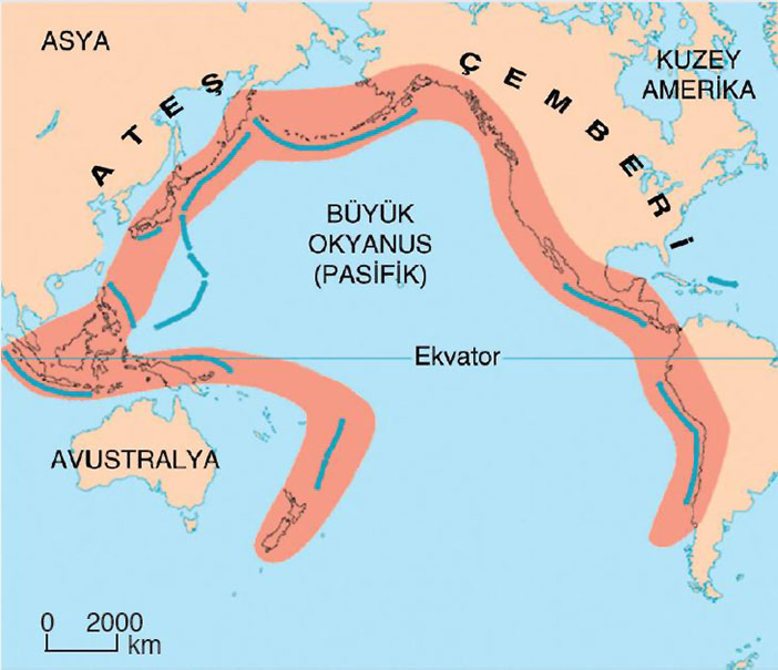 Bu bölgede depremlerin yüzde 80'i gerçekleşir. Bu çember yaklaşık 40.000 kilometreyi kapsar. Dünyanın en derin çukuru da bu çemberin içerisindedir.