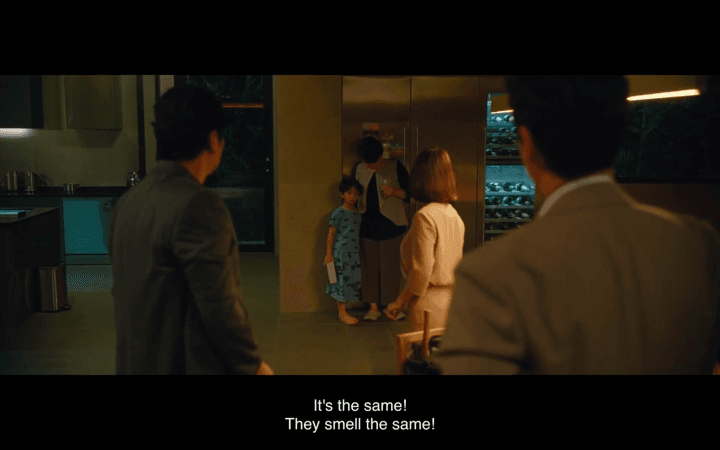 The smell is a motif running through the story to underline the deep connection among family members and the hidden tensions between social classes. One of the remarkable scenes about smell is when Da-song, the young son of the Parks, rushes downstairs to meet his father. He suddenly sniffs in the air and digs his nose into Ki-Taek's pants and then Choong-Sook's belly. This instant showed their special connection—the bonding among members of the Kim family—since their smell is a class marker of experiences in the same life.